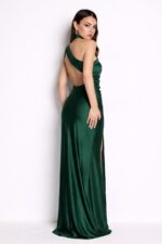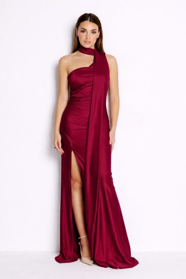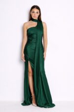 Vestido largo de licra satinada, con tirante asimétrico con banda ancha que cruza desde el cuello (tipo halter) hacia un hombro cayendo hacía delante, con espalda descubierta cruzada, con drapeado en la cintura y abertura cruzada.