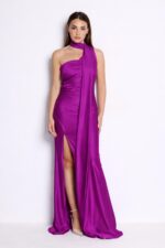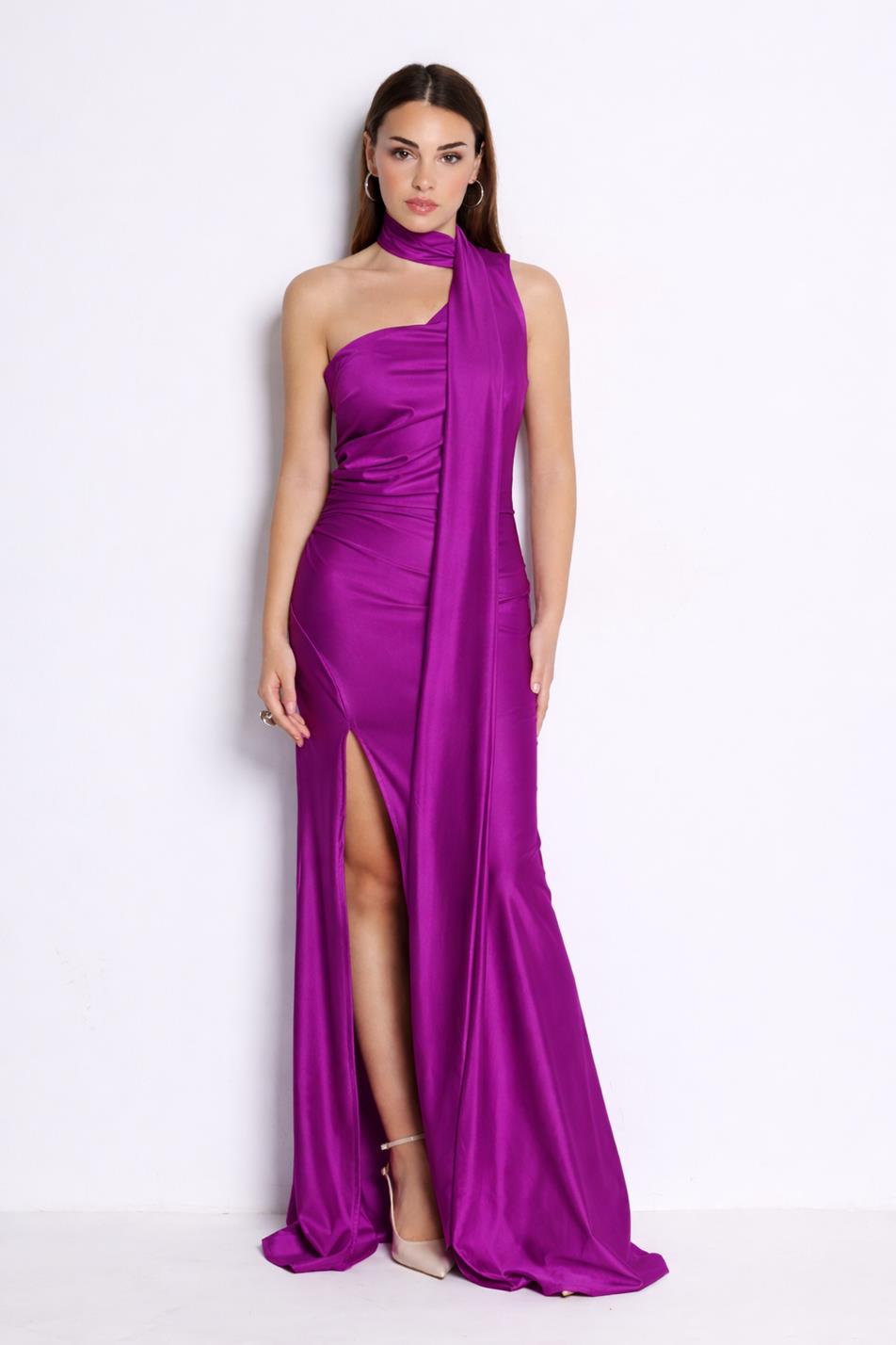 Vestido largo de licra satinada, con tirante asimétrico con banda ancha que cruza desde el cuello (tipo halter) hacia un hombro cayendo hacía delante, con espalda descubierta cruzada, con drapeado en la cintura y abertura cruzada.