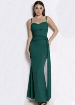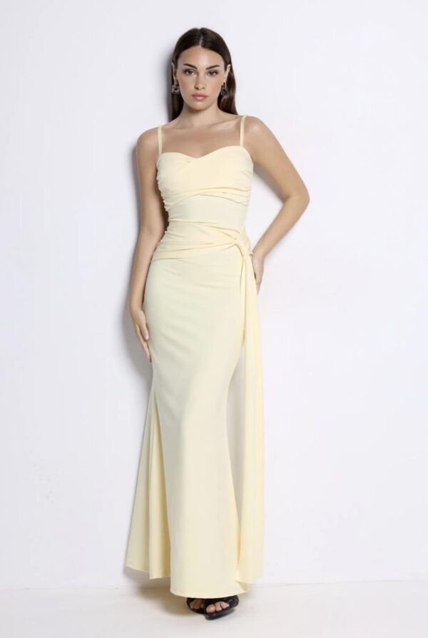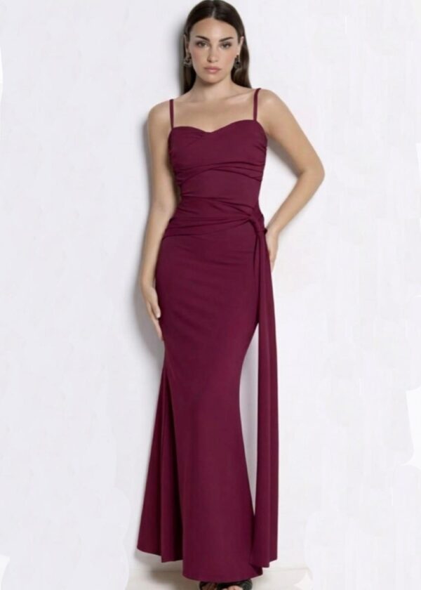 Vestido de licra largo de tirantes regulables, de escote corazón, drapeado en el pecho y con detalle en la cadera en forma banda que cae hasta el suelo aportando movimiento.