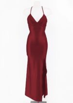 Vestido de corte entallado, de licra satinada, con escote en V , cazuelas, de tirante fino y espalda cruzada, con abertura lateral.