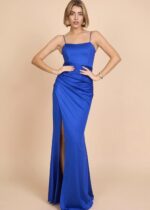 Vestido largo de corte entallado, de licra satinada, con tirante fino regulable y escote en la espalda cruzado, drapeado en la parte de la cadera, fruncido en la parte trasera, con cazuelas.