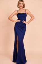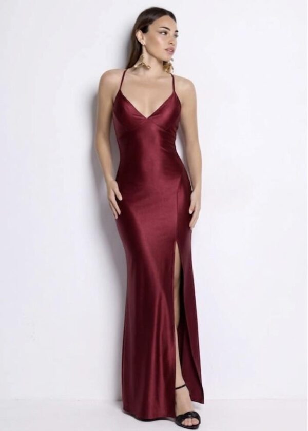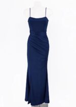 Vestido largo de corte entallado, de licra satinada, con tirante fino regulable y escote en la espalda cruzado, drapeado en la parte de la cadera, fruncido en la parte trasera, con cazuelas.
