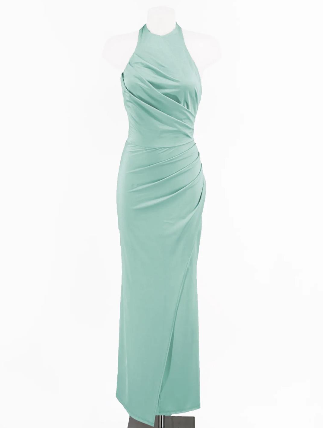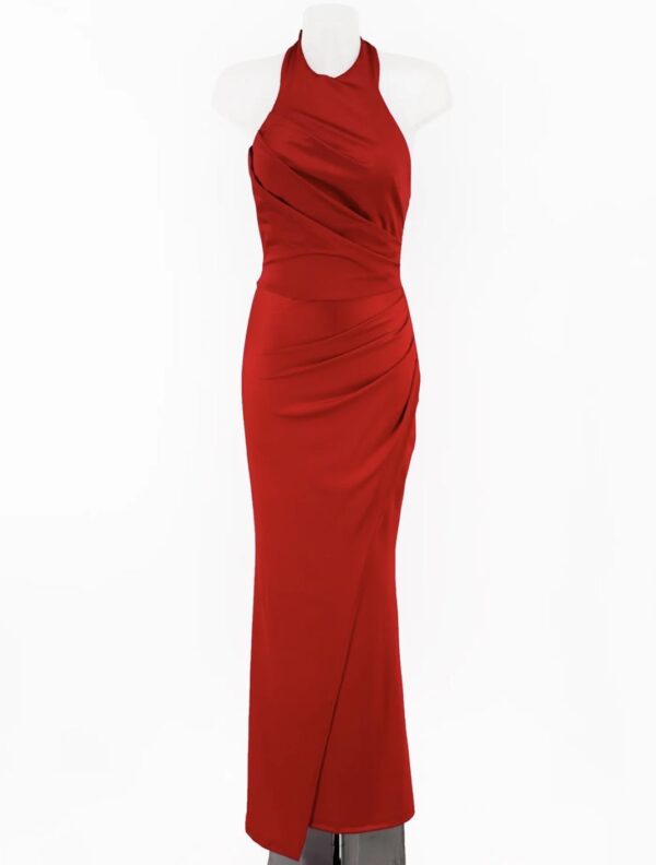 Vestido largo confeccionado en licra satinada, drapeado, de cuello halter y lazada al cuello, con abertura lateral.