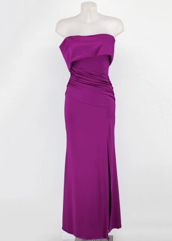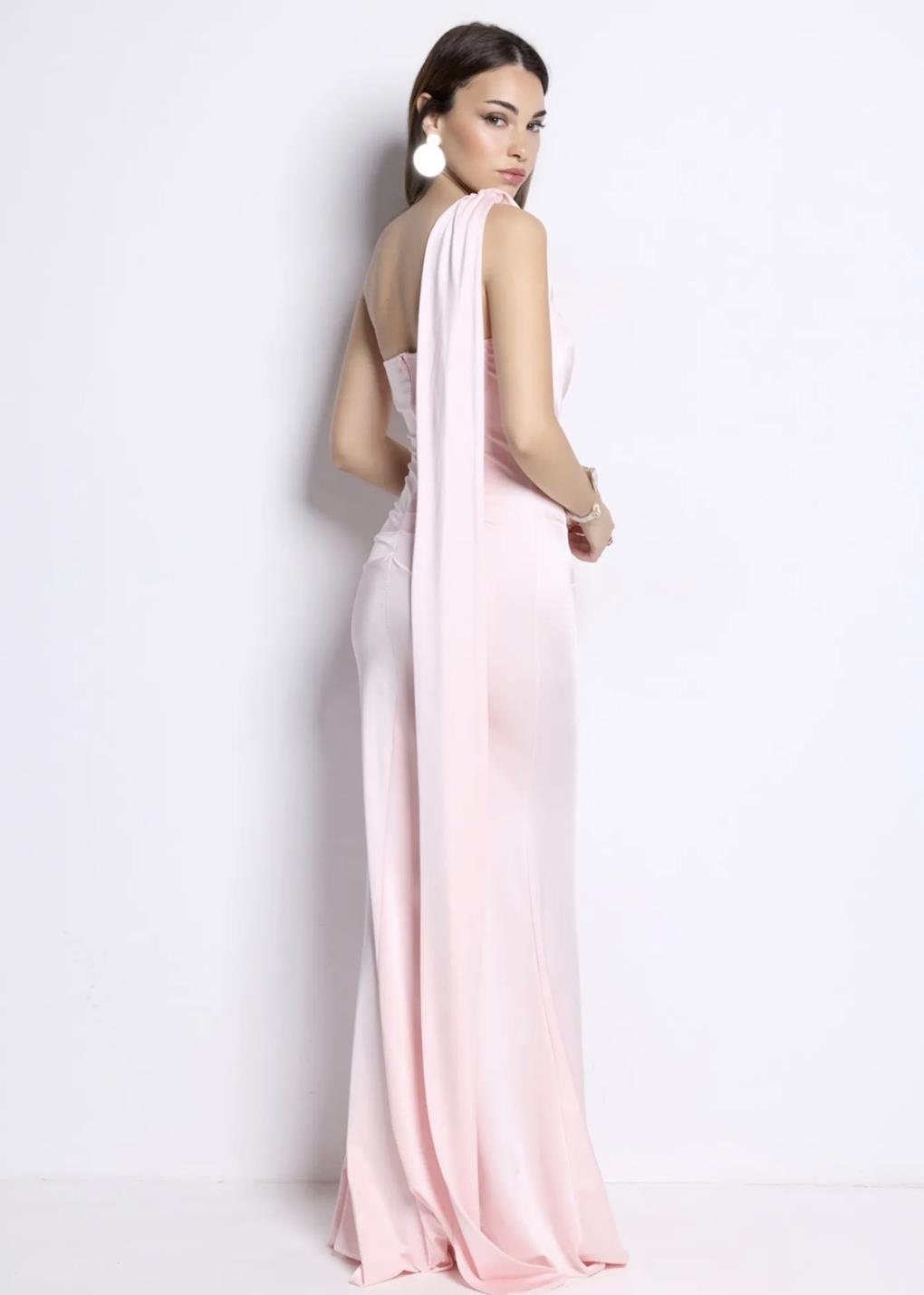 Vestido largo de licra de corte sirena, de escote asimétrico y cuerpo drapeado. Caída desde el hombro y fruncido en la parte trasera, con cremallera invisible en la espalda, abertura lateral.
