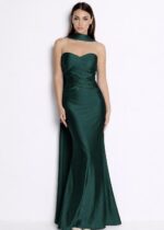 Vestido de corte sirena, confeccionado en licra satinada, de escote palabra de honor, drapeado entrecruzado en la zona del pecho hasta la cintura, lleva una pieza tipo fular cosido a los tirantes para que no se caiga haciendo efecto choker de la misma tela aportando movimiento, con cazuelas.