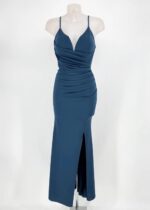 Vestido de corte sirena, con escote V de tirante fino y abertura