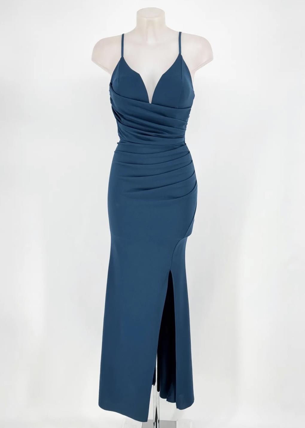 Vestido de corte sirena, con escote V y tirantes finos regulables, cuerpo drapeado, con cazuela, abertura lateral, cremallera invisible en la espalda.
