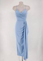 Vestido midi de licra. con corte recto, escote de pico con drapeado frontal, tirante finos regulables y corte a la cintura. Detalle de fruncido lateral con caída. Espalda recta con cremallera invisible. Con cazuelas