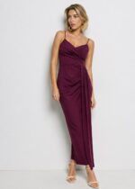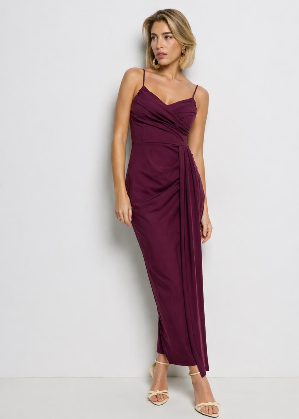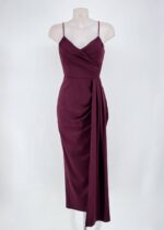 Vestido midi de licra. con corte recto, escote de pico con drapeado frontal, tirante finos regulables y corte a la cintura. Detalle de fruncido lateral con caída. Espalda recta con cremallera invisible. Con cazuelas