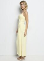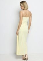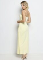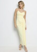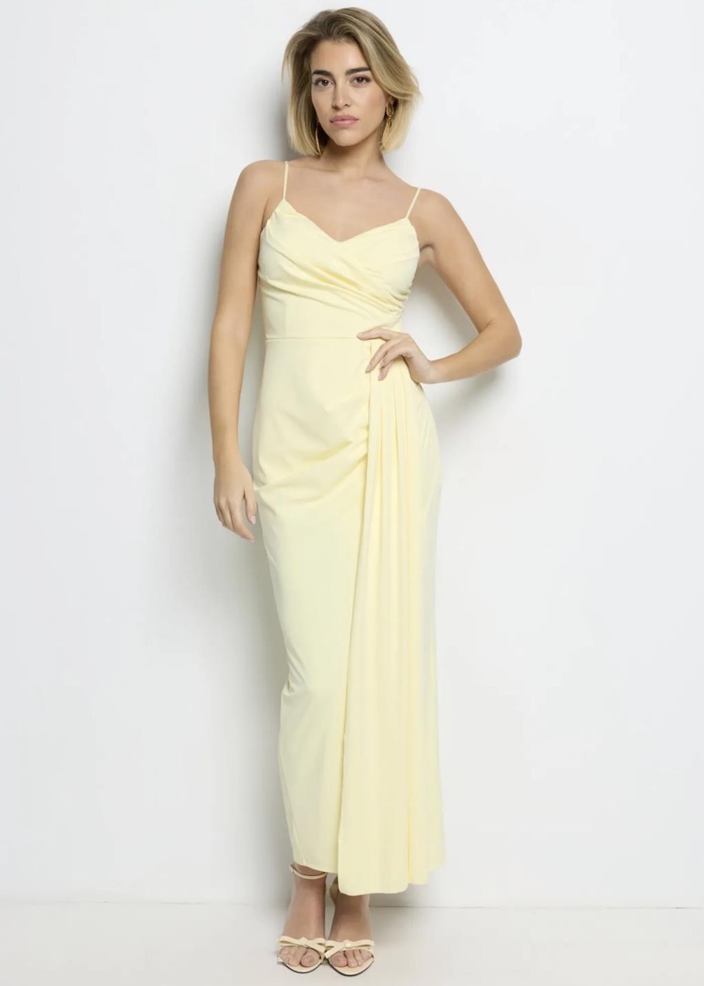 Vestido midi de licra. con corte recto, escote de pico con drapeado frontal, tirante finos regulables y corte a la cintura. Detalle de fruncido lateral con caída. Espalda recta con cremallera invisible. Con cazuelas