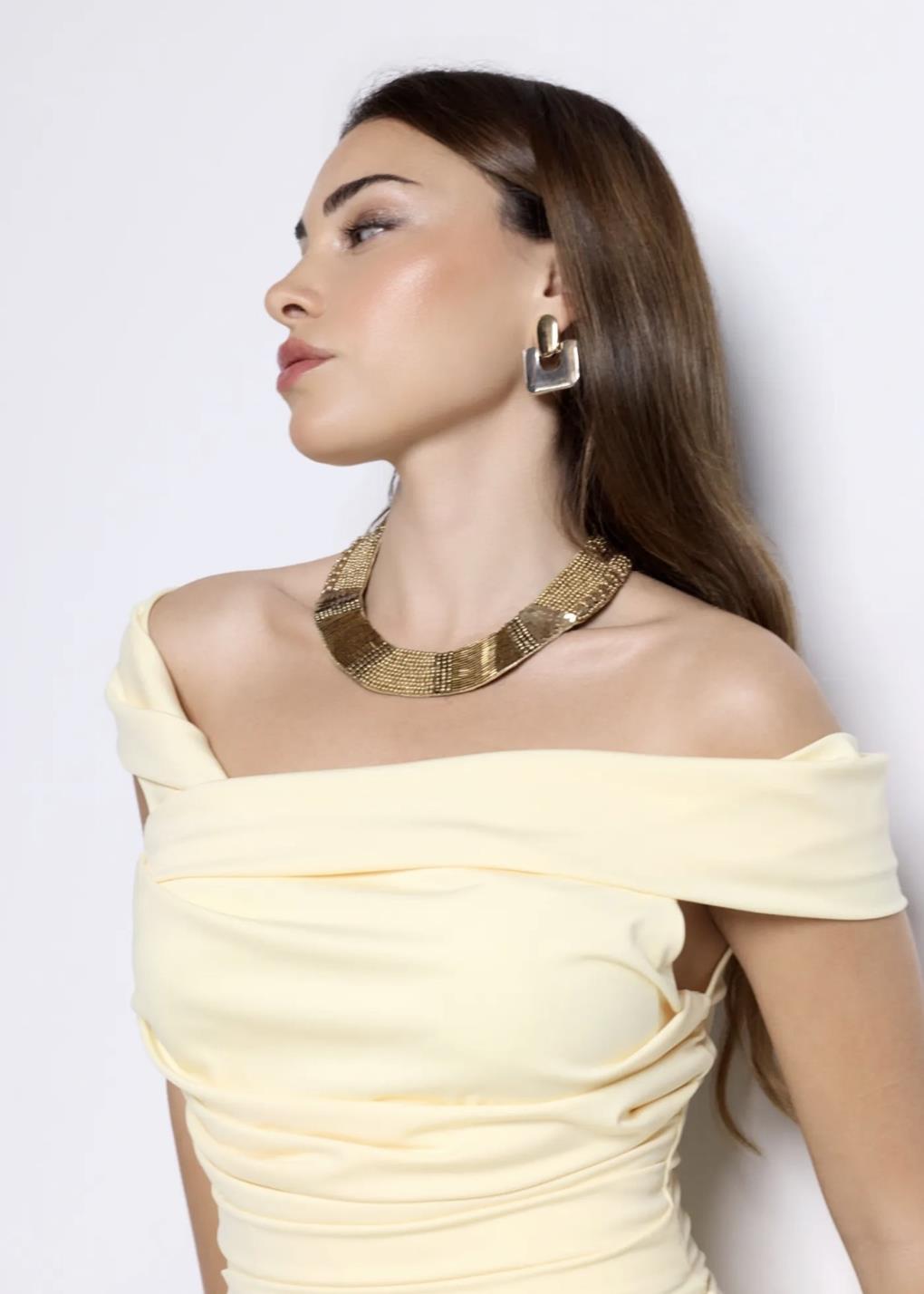 Vestido largo de corte sirena, de escote barca con cuerpo entallado y fruncido lateral que estiliza la silueta. Falda de caída recta, abertura y drapeado frontal, con cremallera trasera invisible.