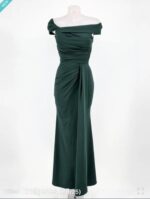 Vestido largo de corte sirena, de escote barca con cuerpo entallado y fruncido lateral que estiliza la silueta. Falda de caída recta, abertura y drapeado frontal, con cremallera trasera invisible.